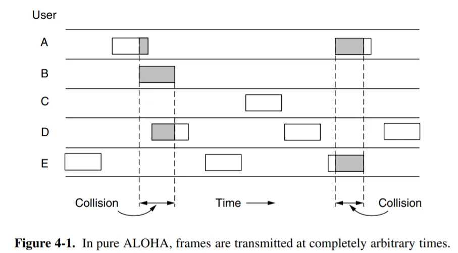 基本思想很简单:每个用户有数据需要发送的时候就直接传输。问题在于,当两个用户的发送的信号重叠时(冲突 collision),就会导致冲突帧损坏。