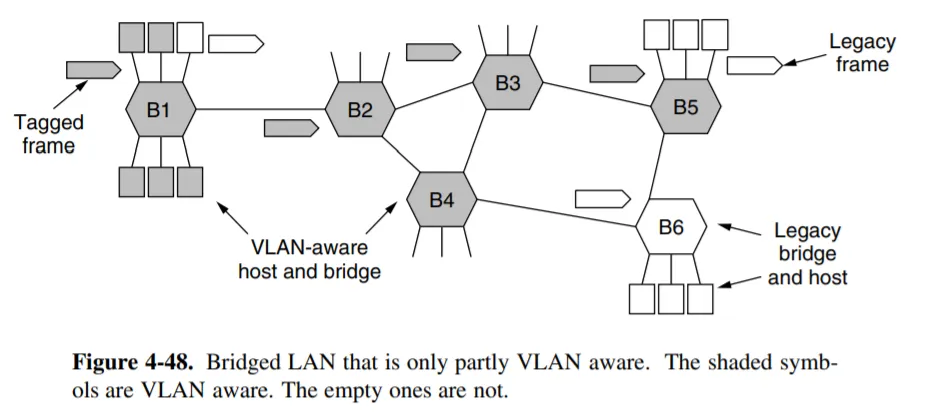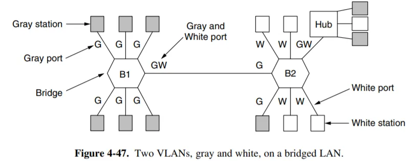 - 例如,当某台属于Switch A的VLAN 1的PC想发数据帧给Switch B下的任意一台PC时,都会失败;因为Switch A会**泛洪**给所有属于VLAN1的其他端口,结果就是根本不可能转发给B