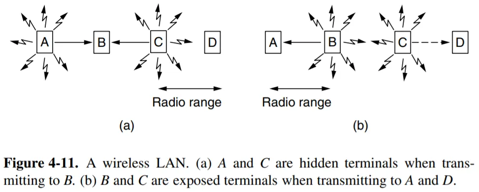 如上图 (b),B 正在给 A 发送消息;此时 C 试图给 D 发送消息,但是它侦听到了来自 B 的信号,认为此时应该等待。而事实上,此时 C 给 D 发送信号并不会受到干扰;因此这种等待引发了无意义的时延。