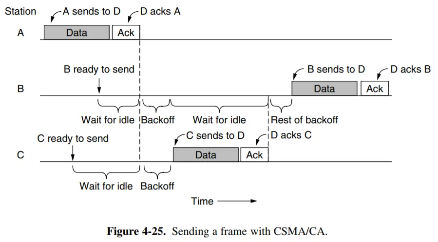 从后退开始:在CSMA/CD中,我们是检测到冲突后,进行一个随机避退;而CA中,我们无法检测到冲突,所以只能先进行随机避退,来最大可能地降低冲突的概率