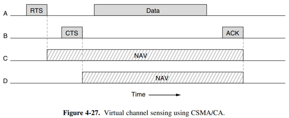 D 的反应: D 虽然听不到 A,但它能听到 AP 的 CTS 广播。这个 CTS 就像一个“全体安静!”的命令。D 收到后,会查看 CTS 中的时长信息,并设置自己的 NAV(虚拟传感),在A的传输时间内保持沉默。