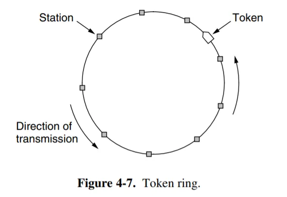 - 以循环的方式,将Token依次传输给下一个站看是否要进行传输;这样就保证了一个时间只会有一个站会传输信息
