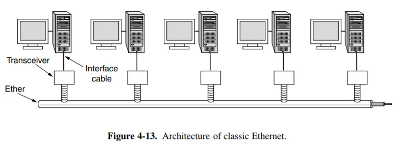 - 上图显示了经典以太网(如 10BASE5)的物理层。以太网的每个版本都有电缆长度的限制;超过这个限制的网络可以用 中继器 repeater 将多条线缆连接起来。但是收发器 transceiver 之间仍然有最大距离 2.5 km 和最大经过中继器数目 4 个的限制。在这些电缆上,信息的发送采用 Manchester 编码。